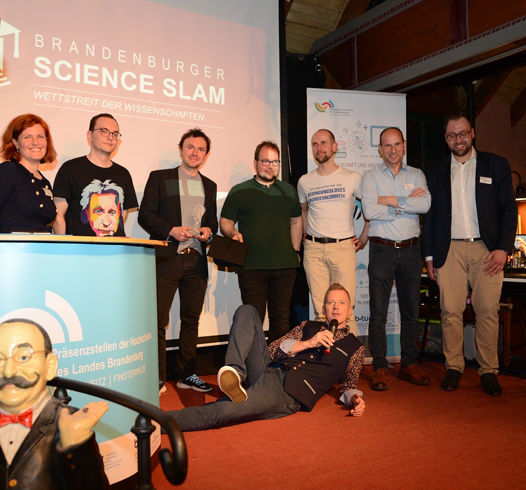Als erster Slammer wurde Julian Stähle, Masterstudent an der Universität Potsdam, ausgelost. Er entführte das Publikum mit seinem Slam "Die Physik der Wolf Rayet Sterne" in die Tiefen des Universums. Zweiter Slammer des Abends war Bastian Prell. Er ist Doktorand im Graduiertenkolleg IKC IE, einer Kooperation der TH Wildau und der der BTU Cottbus - Senftenberg. In seinem Slam "Innovation und Akzeptanz" verdeutlichte er, dass Innovation das Kuchenstück für jeden von uns größer macht und neue Innovationen nicht sofort angenommen werden. Nach diesem amüsanten Slam erfuhren wir von Moritz Kirchner, Geschäftsführer & Trainer vom Institut für Kommunikation und Gesellschaft, ab wann man von einer Verschwörungstheorie sprechen kann und wie man damit umgeht. Zuletzt erfreute sich das Publikum am Slam "Gute Arbeit" von Richard Rath, Doktorand an der BTU Cottbus-Senftenberg. Richard Rath hatte sich ein Vorbild am Poetry Slam genommen und trug ein Gedicht mit viel Selbstironie zu seiner Doktorarbeit vor. Ein weiteres kleines Highlight für die Gäste war das Wissensquiz vor der Pause. Die beiden Sieger des Quiz traten vor der Siegerehrung der Slammer auf der Bühne zu einem Stechen an und wurden vom Brauhaus mit hauseigenen Spezialitäten belohnt. Sieger des Abends war Bastian Prell, der damit schon seinen zweiten Sieg beim Brandenburger Science Slam einholen konnte. Der Abschluss des Abends wurde durch die Musikerin und Songwriterin Gabriela Dombrowe gekrönt.