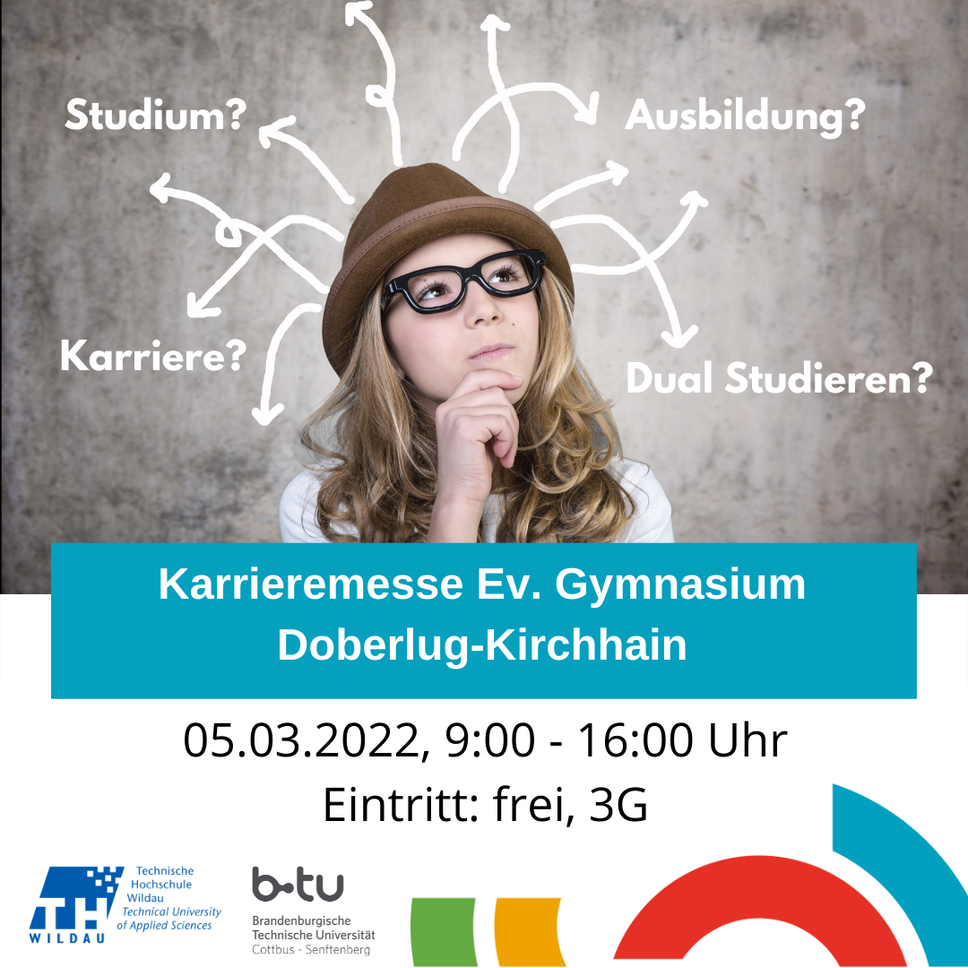 Der Seminarkurs Politische Bildung der 12. Klasse des evangelischen Gymnasiums Doberlug-Kirchhain haben eine Karrieremesse für Schülerinnen und Schüler organisiert. Wir sind vor Ort dabei und stehen Euch zu allen Fragen rund ums Studium zur Verfügung. Schaut doch einfach mal vorbei. Ihr habt die Möglichkeit, mit zahlreichen Unternehmen der Region in Kontakt zu treten und Euch umfassend zu Ausbildungs- und Studienmöglichkeiten zu informieren.
