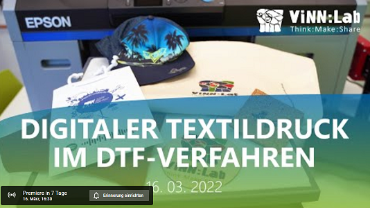 Im diesem Workshop zum Vollfarb-Textildrucker des ViNN:Labs wird das DTF Verfahren, also „direct to film“ vorgestellt. Dabei kann der Druck mithilfe einer speziellen Transferfolie auf Textilien und andere Materialien übertragen werden, die nicht direkt in den Drucker eingelegt werden können.Seid gespannt mit welchen Materialien das ViNN:Lab experimentiert und welche Ergebnisse sich wirklich sehen lassen können.